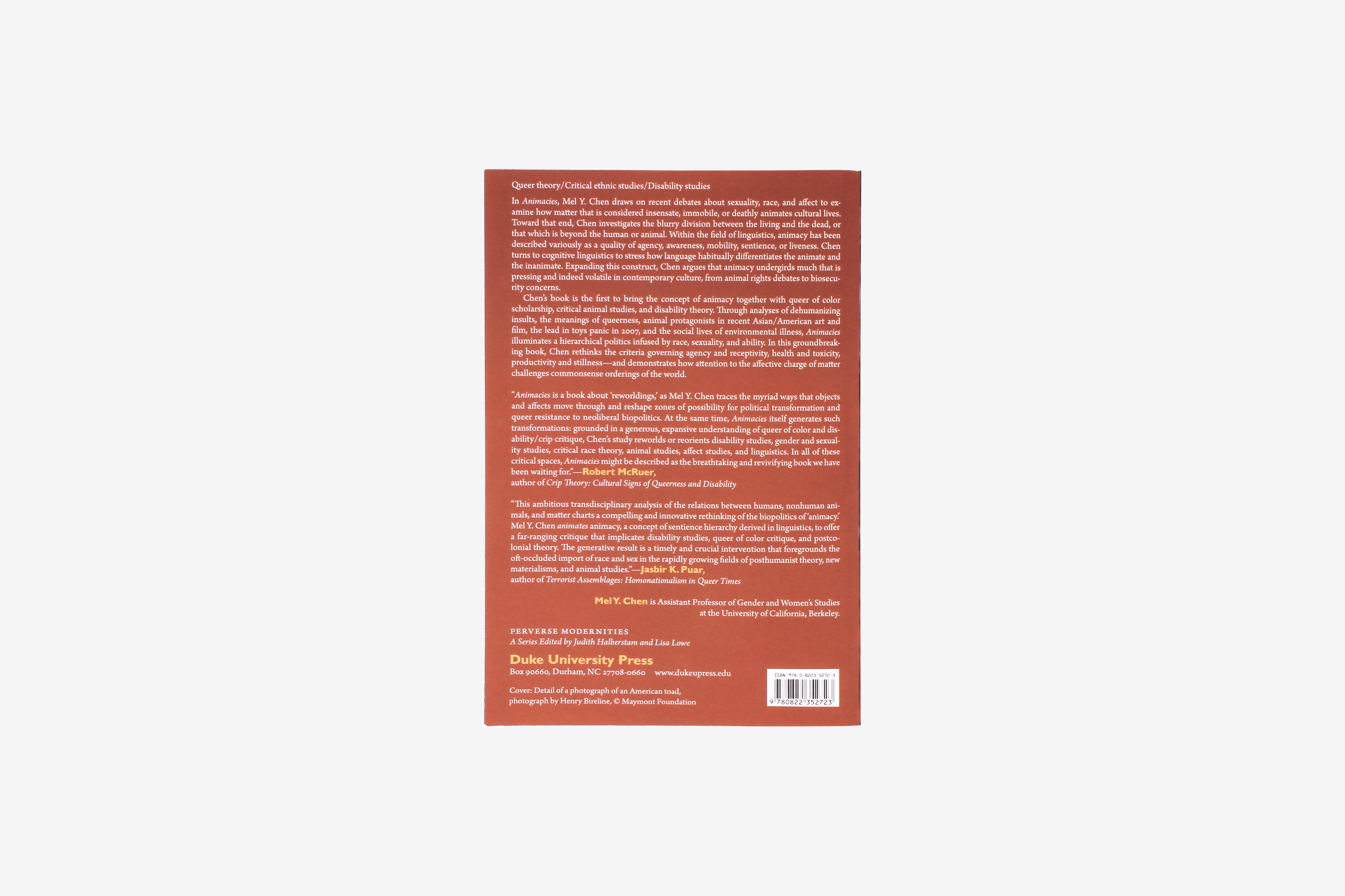 Chen's book is the first to bring the concept of animacy together with queer of color scholarship, critical animal studies, and disability theory. Through analyses of dehumanizing insults, the meanings of queerness, animal protagonists in recent Asian/American art and film, the lead in toys panic in 2007, and the social lives of environmental illness, Animaciesilluminates a hierarchical politics infused by race, sexuality, and ability. In this groundbreaking book, Chen rethinks the criteria governing agency and receptivity, health and toxicity, productivity and stillness—and demonstrates how attention to the affective charge of matter challenges commonsense orderings of the world.