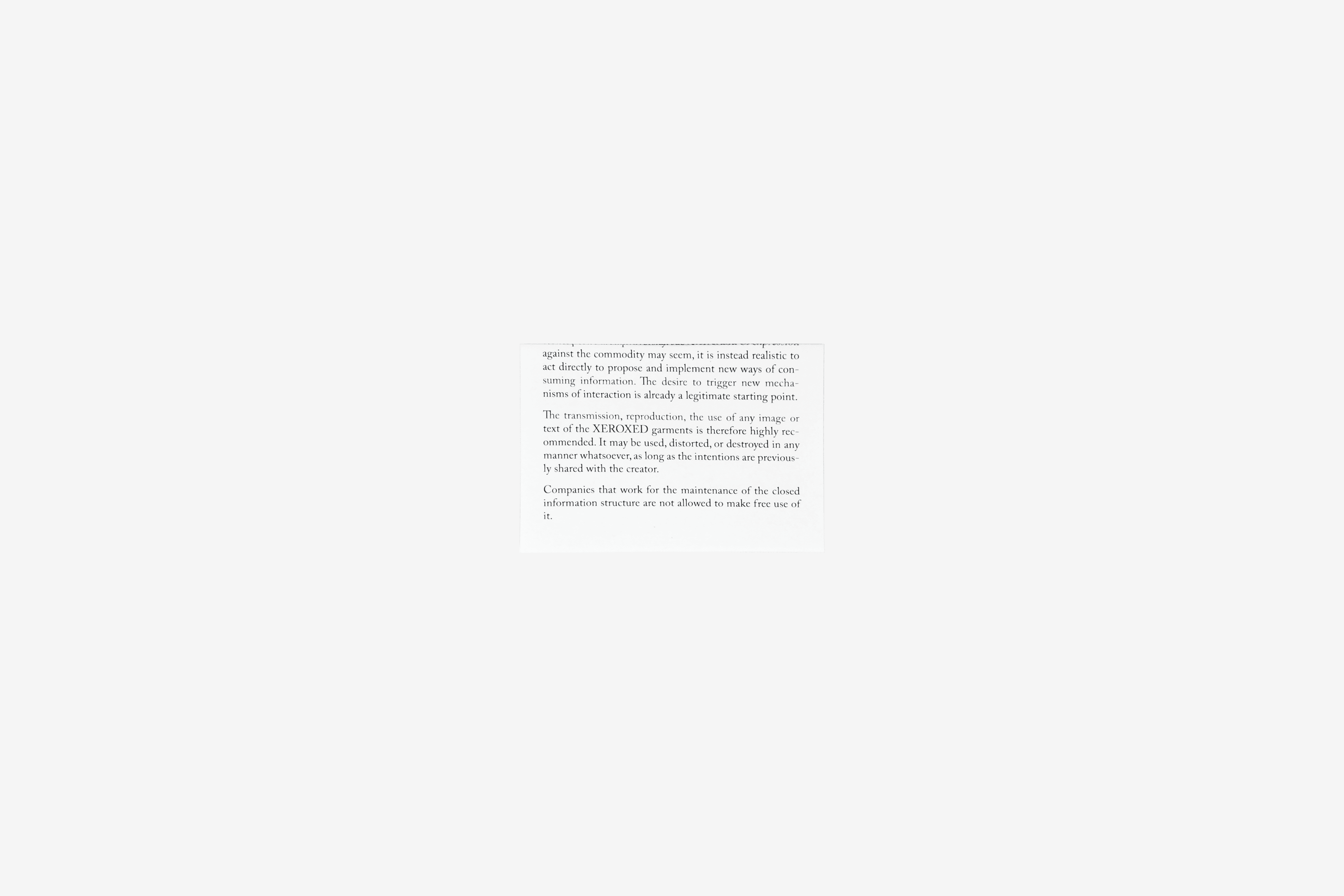 XEROXED works with editions, each one of them highlighting specific topics and publications. Depending on the edition, XEROXED opens up a conversation with archives, libraries, and private collections. The extracted material is re-activated, re-interpreted, and re-published through the garments, which become the main tool for the (re-)circulation of the information.