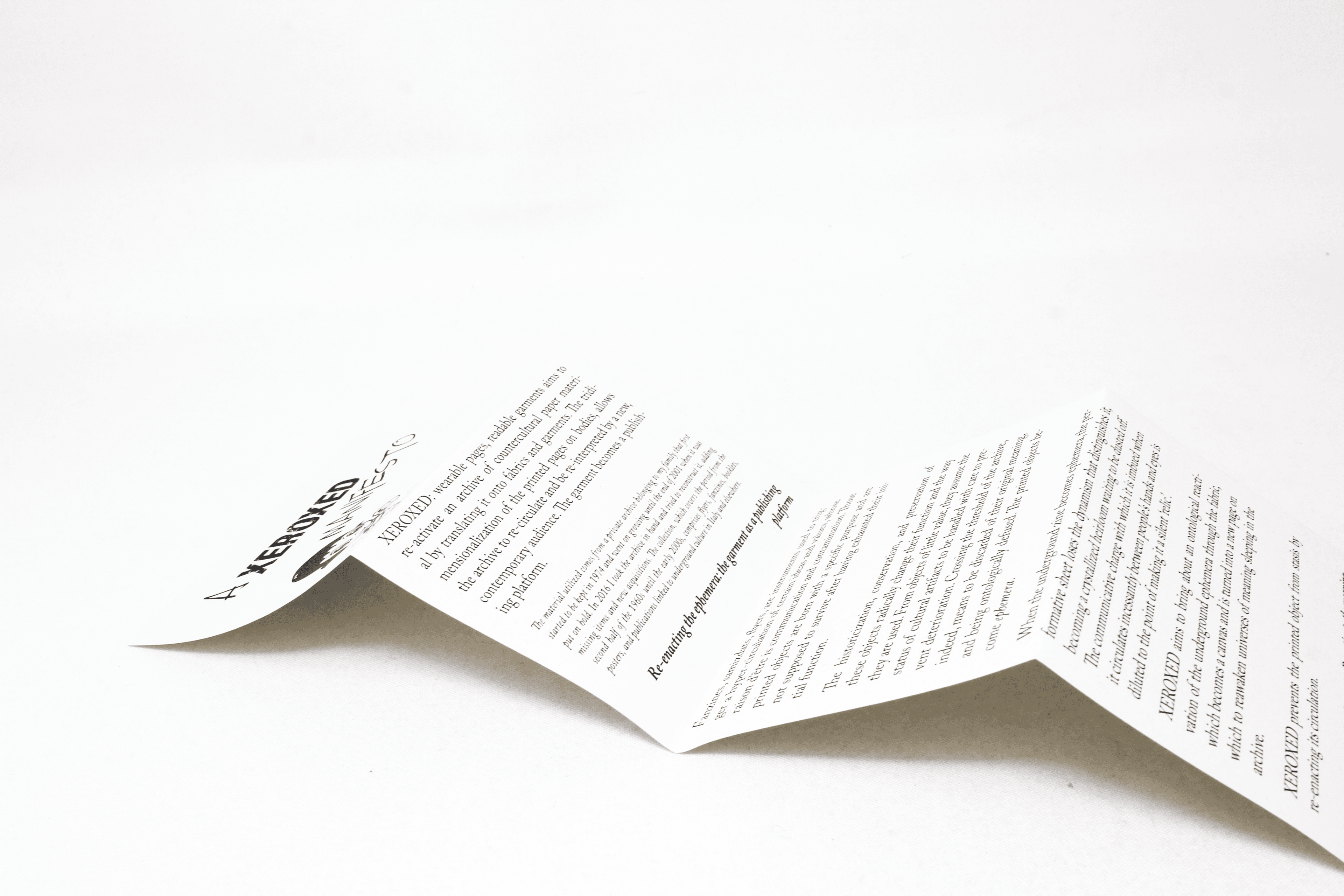 XEROXED: wearable pages, readable garments is a garment publishing platform that investigates the relationship between body, garment, and publication through the translation of paper material into wearable publications. The platform specifically aims at (re)publishing materials explicitly positioned in the margins, outside, and in contraposition with the dominant capitalistic media cultural production, making it available for a contemporary (re)-read. XEROXED digs into archives, drawers, warehouses, and libraries in search of the unpublishable, the forgotten, the under-ground. The published material is selected by analysing the potential that it can have in contemporary political discourse, and to what extent it could possibly shake individual consciences and plant a seed of sprouting reflection. Through the juxtaposition, mix, and re- configuration of the archival material, new inputs are created on the XEROXED garments, which become potential tools that can stimulate conversations, reflections, and debates among those who come across them in public spaces.