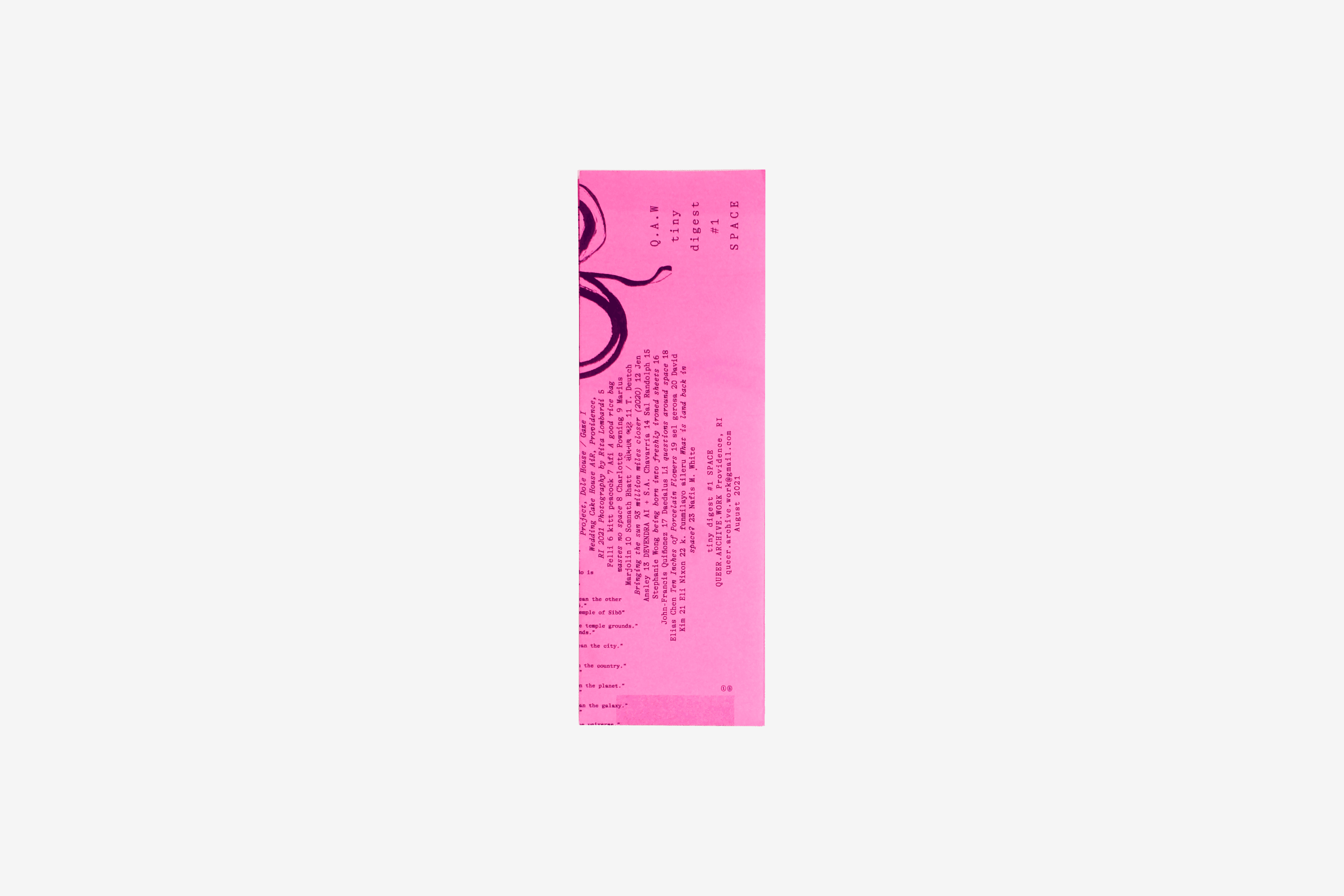 TINY DIGEST #1 is a slow, distributed-by-hand QAW newsletter printed on a single sheet of cheap paper. It was designed to be assembled quickly, easily printed, and mailed out in an ordinary business envelope. An open call to the QAW community resulted in 23 contributions around the theme of space—queer space, taking up space, sacred space, porous space, safe space, outer space, spaced out, shared space, screen space, etc.