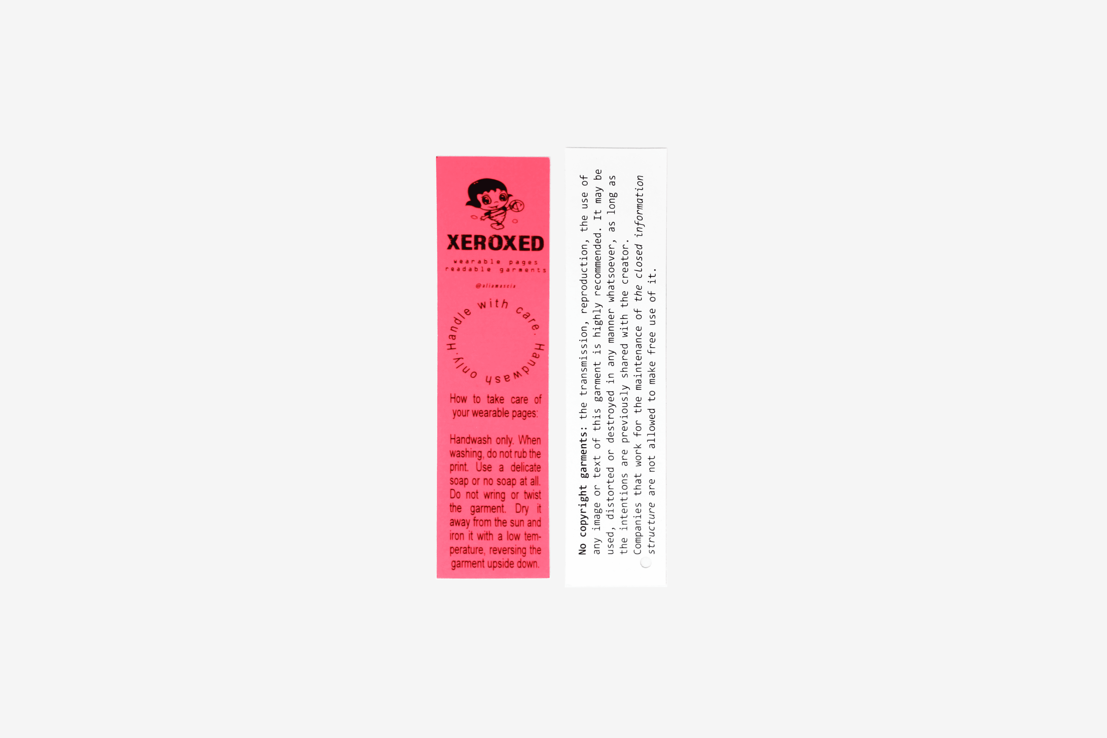 XEROXED: wearable pages, readable garments is a garment publishing platform that investigates the relationship between body, garment, and publication through the translation of paper material into wearable publications. The platform specifically aims at (re)publishing materials explicitly positioned in the margins, outside, and in contraposition with the dominant capitalistic media cultural production, making it available for a contemporary (re)-read. XEROXED digs into archives, drawers, warehouses, and libraries in search of the unpublishable, the forgotten, the under-ground. The published material is selected by analysing the potential that it can have in contemporary political discourse, and to what extent it could possibly shake individual consciences and plant a seed of sprouting reflection. Through the juxtaposition, mix, and re- configuration of the archival material, new inputs are created on the XEROXED garments, which become potential tools that can stimulate conversations, reflections, and debates among those who come across them in public spaces.