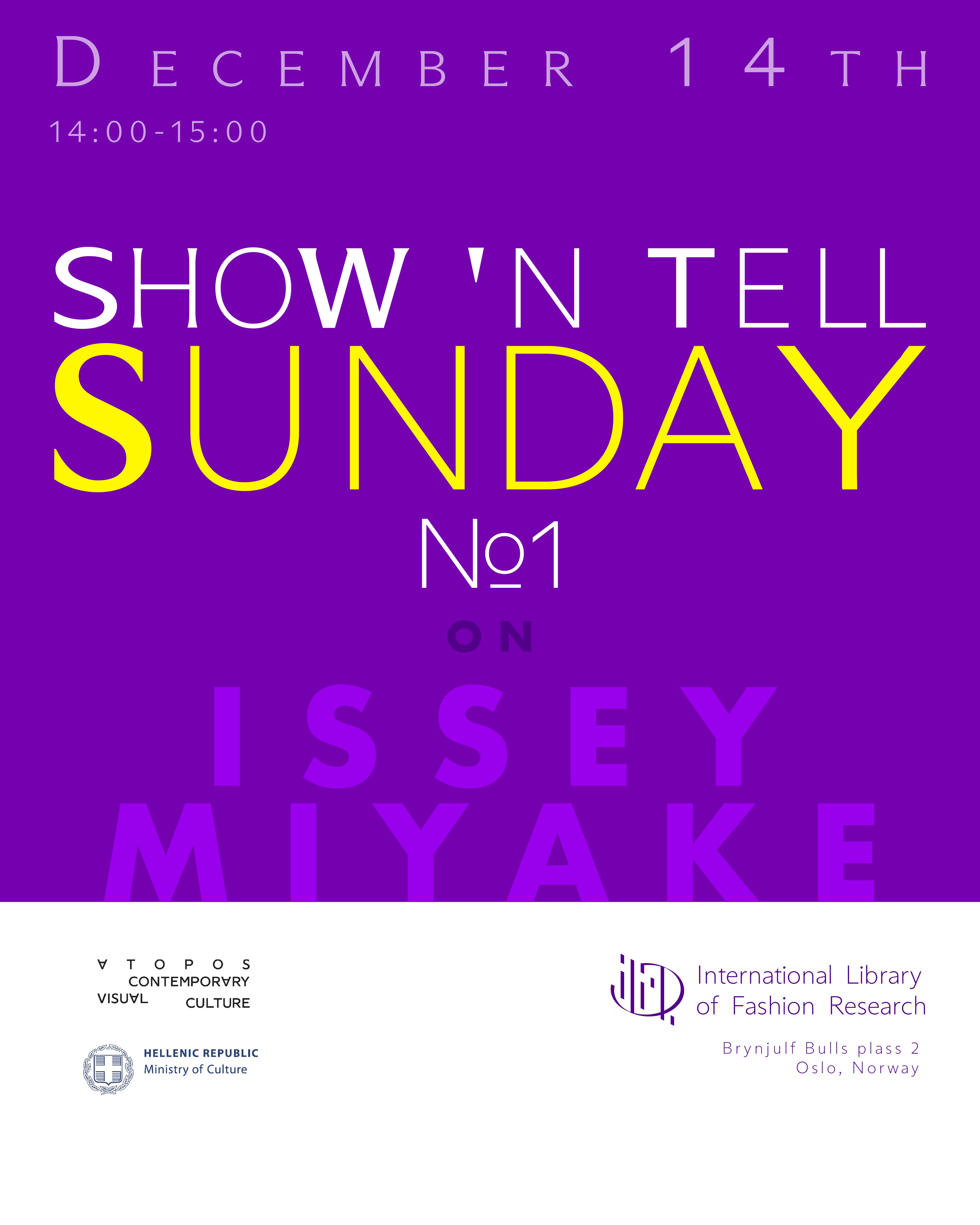 Welcome to Show ’n Tell Sunday on Issey Miyake on upcoming Sunday, 14th of December, from 14.00-15.00. Gløgg will be served & the event is free and open for all.
